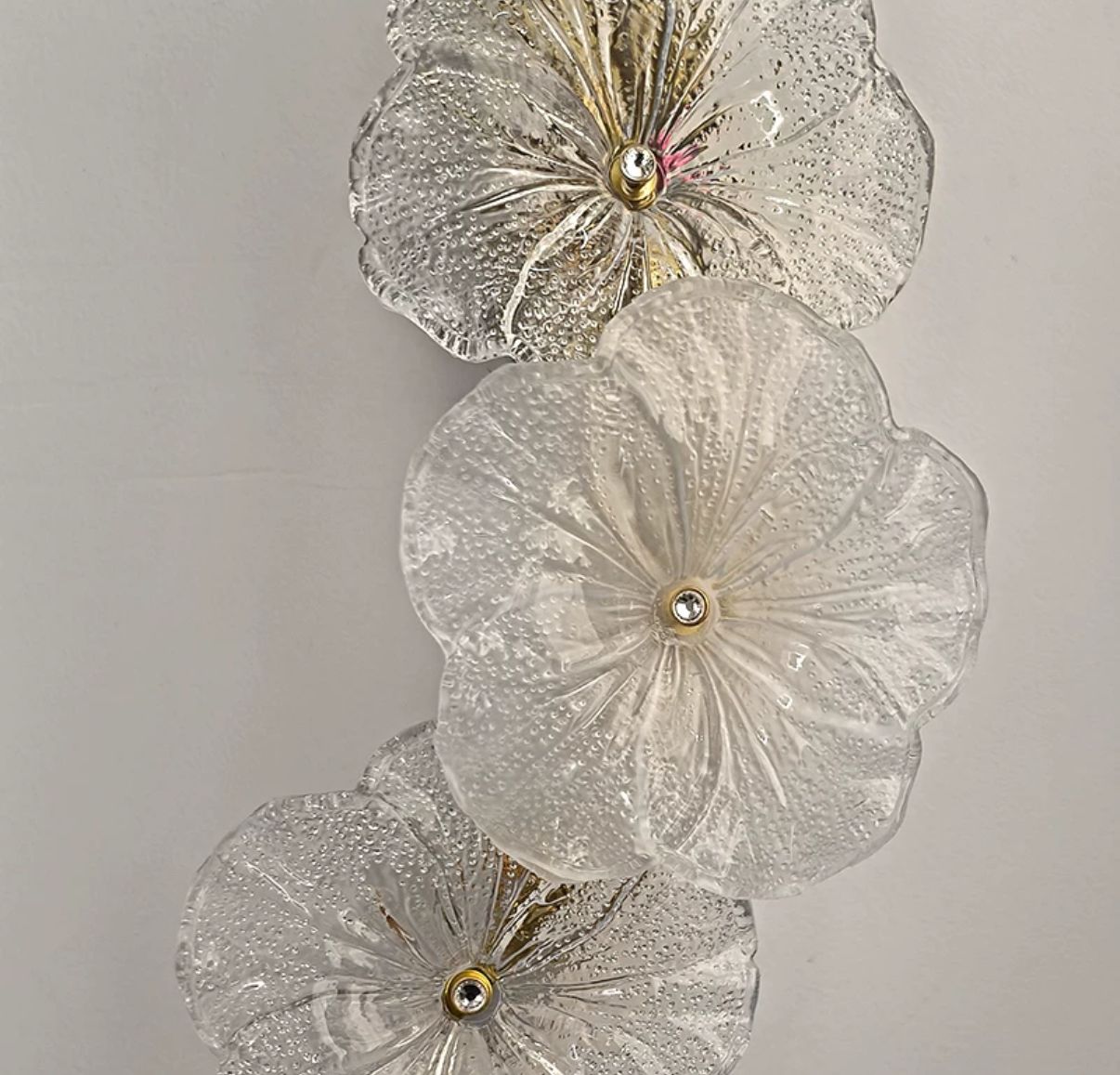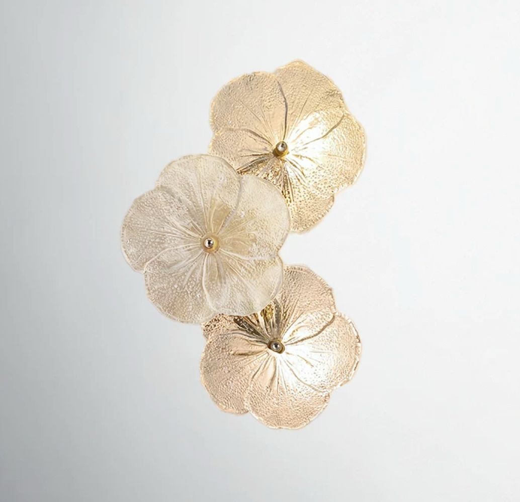 Существуют два варианта этого изысканного бра: меньший, состоящий из трёх цветков, и более крупный, украшенный пятью. Маленький бра – это нежное прикосновение красоты, идеальное для небольших комнат или создания акцентного освещения. Большой бра – это роскошный акцент, способный стать центром внимания в просторной гостиной или спальне.