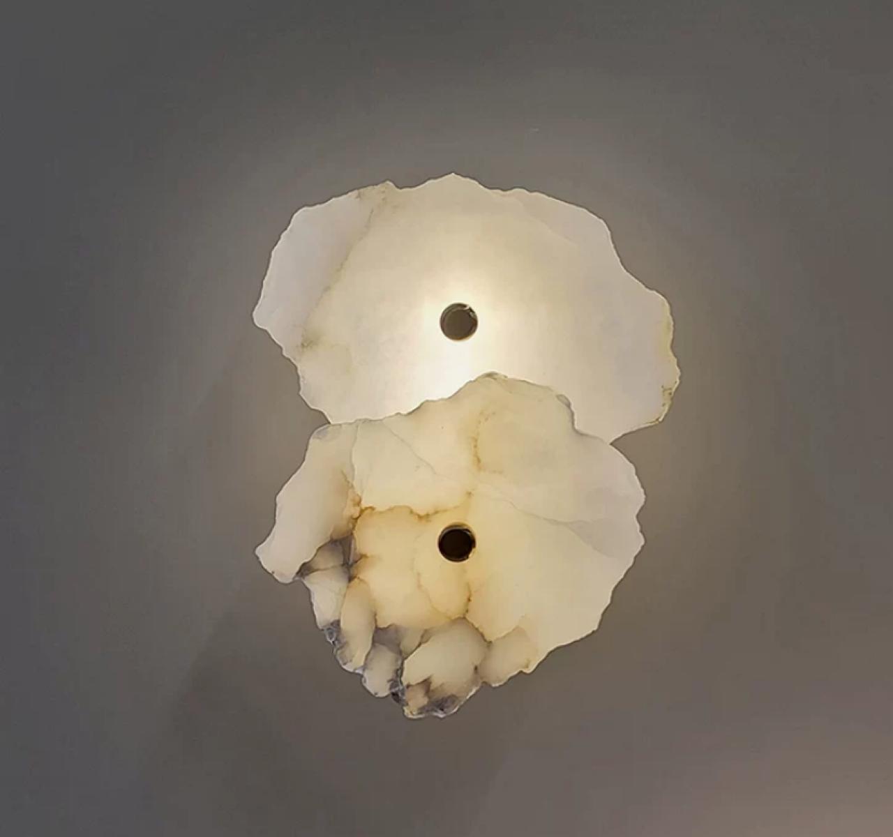 Бра Gia Double от Hpdecor из двух пластин матового камня неправильной формы — это уникальный предмет декора, который привлекает внимание своей необычной и изящной конструкцией. Он создан из нескольких пластинок камня, которые соединены вместе, образуя уникальную форму, которая похожа на срезы оникса.