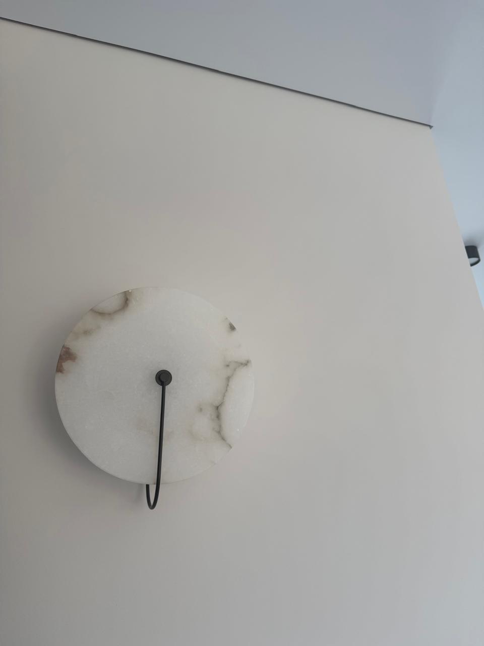 Каменный диск крепится к тонкому, почти незаметному основанию из металла, окрашенного в черный цвет. Это основание – воплощение минимализма: никаких лишних деталей, только чистые линии и функциональность. Черный цвет основания создает контраст с мраморным диском, подчеркивая его красоту и текстуру. Тонкость основания создает иллюзию, будто каменный диск парит в воздухе, добавляя конструкции легкости и воздушности.