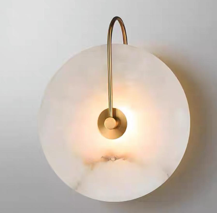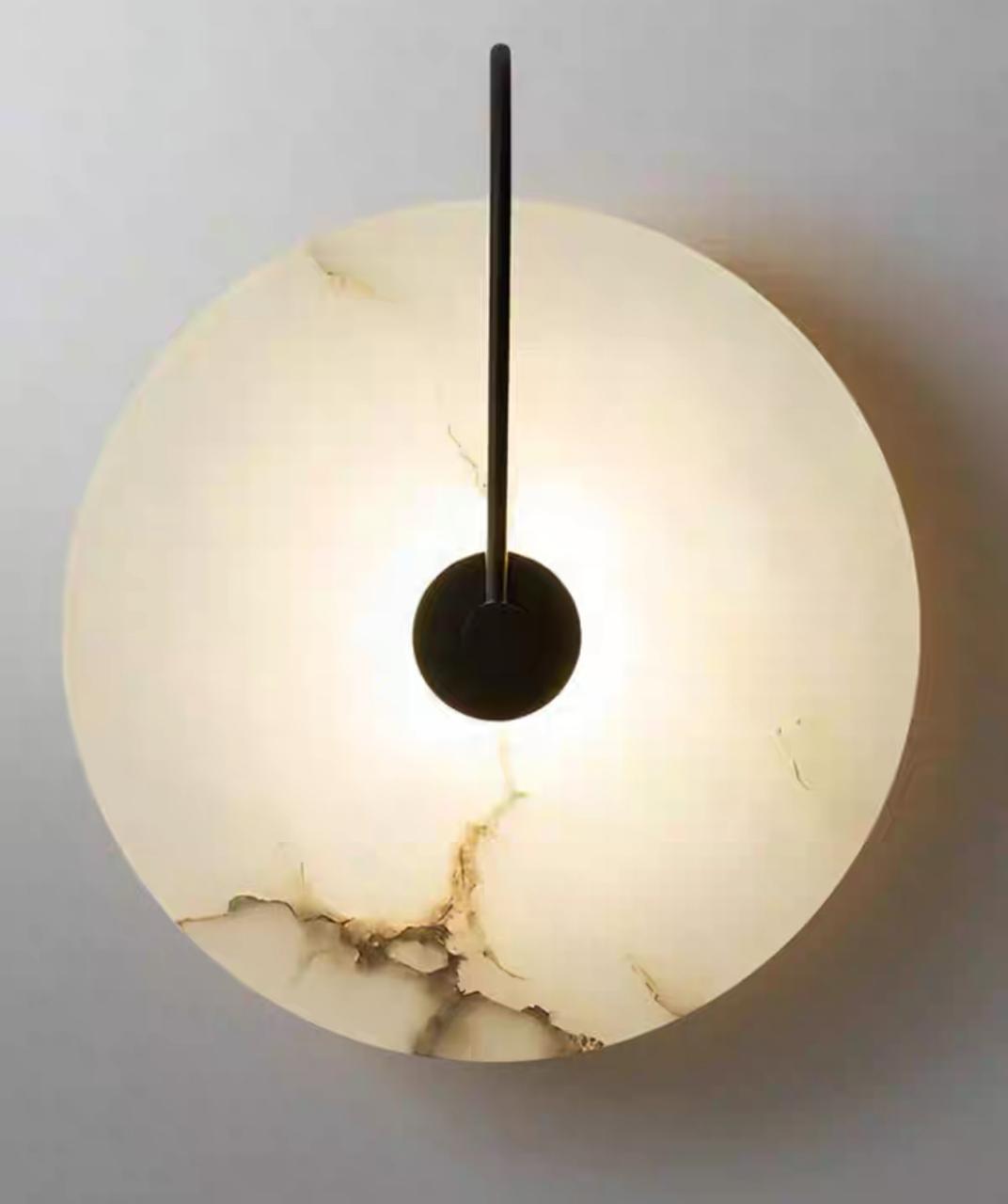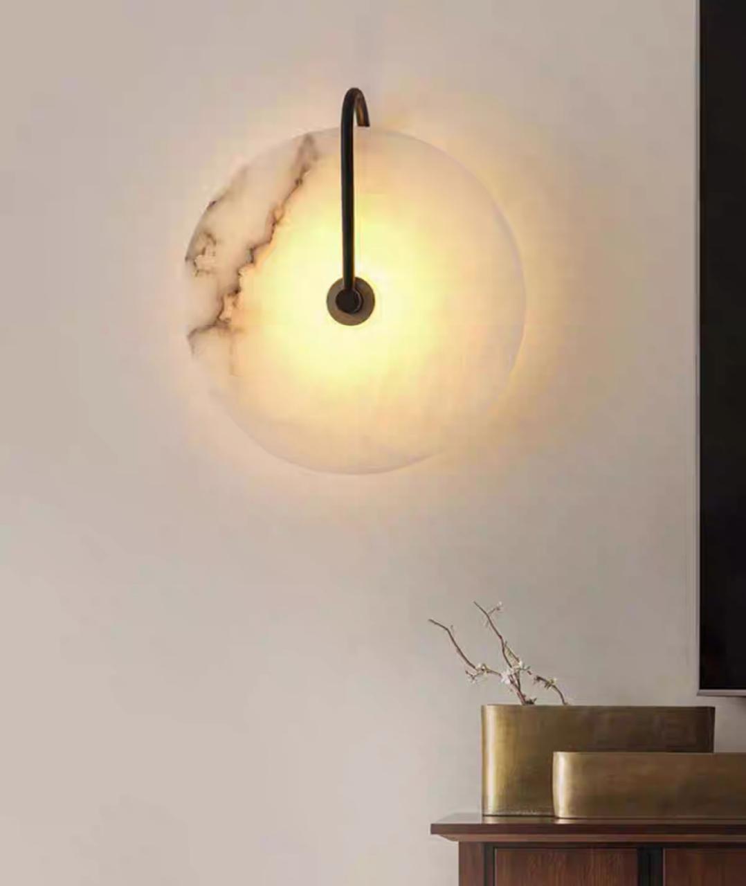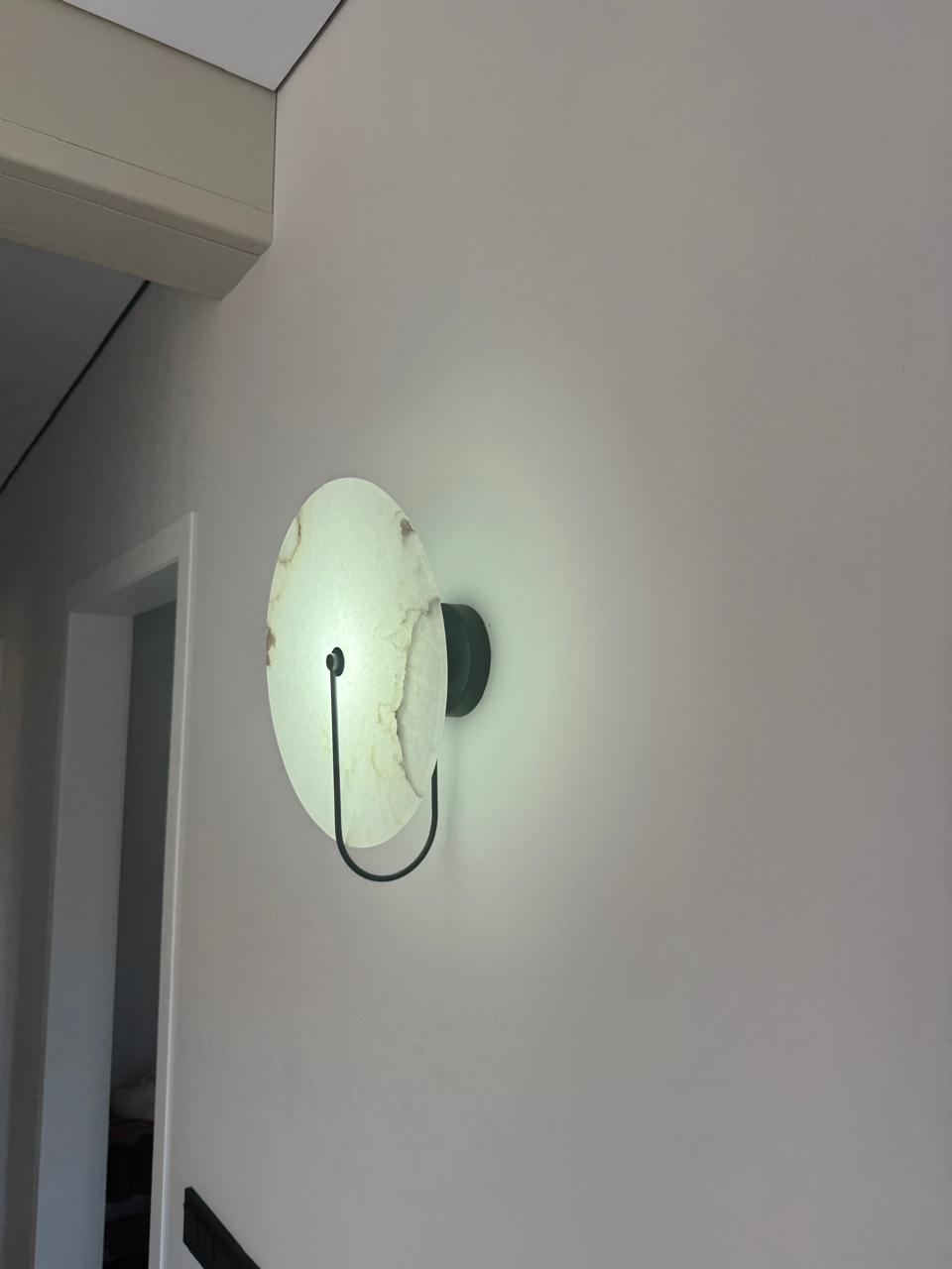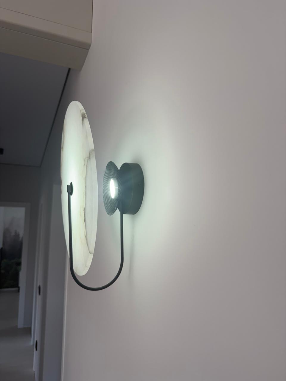 За каменным диском расположен источник света. Скрытый от глаз, он мягко рассеивает свет, создавая вокруг бра ореол таинственности и романтики. Свет, проходя сквозь мраморные прожилки, преломляется и играет, создавая неповторимые узоры на стене. Это бра не только освещает пространство, но и создает особую атмосферу, наполняя комнату теплом и уютом.