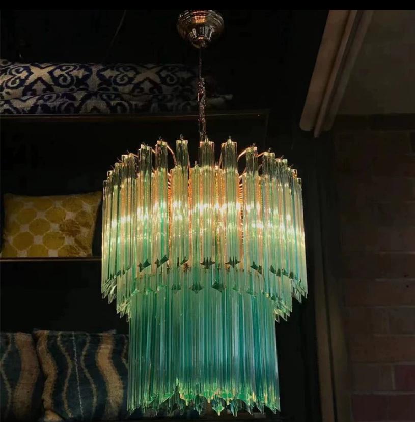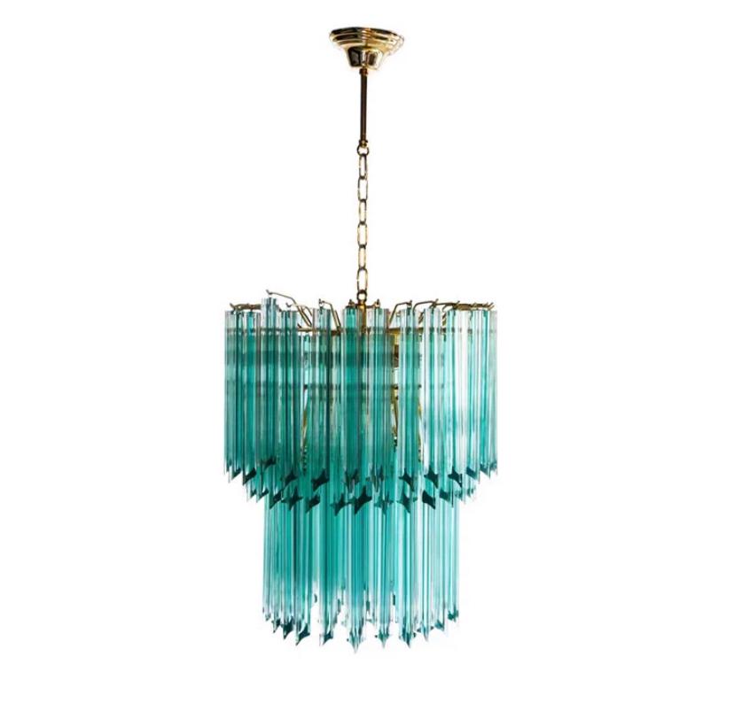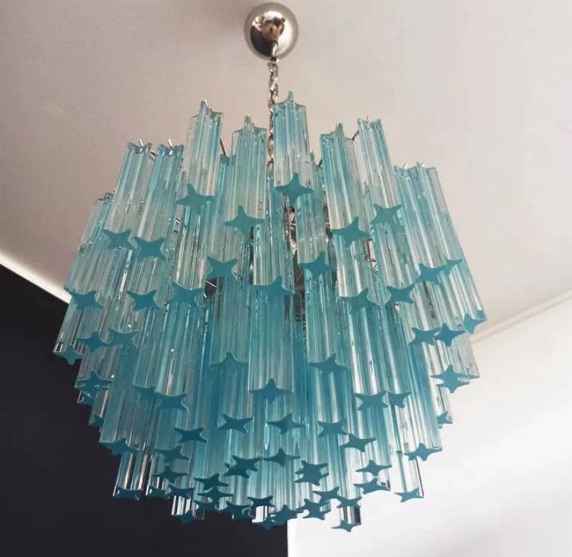 У этой люстры есть необычное строение — свисающие стеклянные пластины, которые формируются в два уровня. Пластины напоминают звезды, которые играют сияющим светом, добавляя в комнату элегантности и изящества.