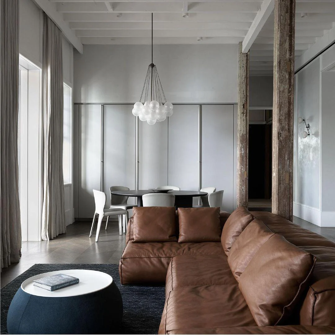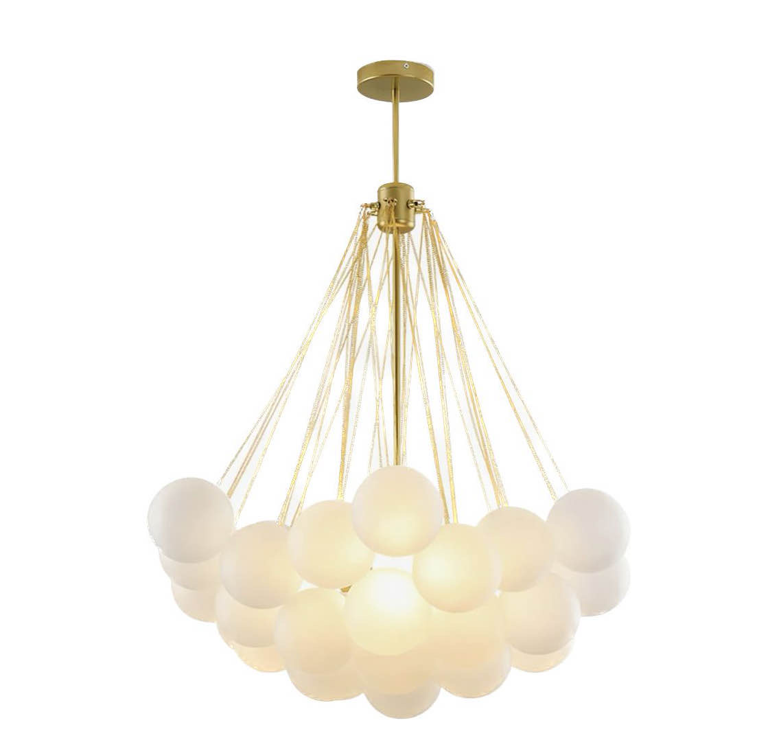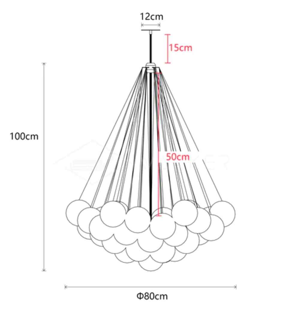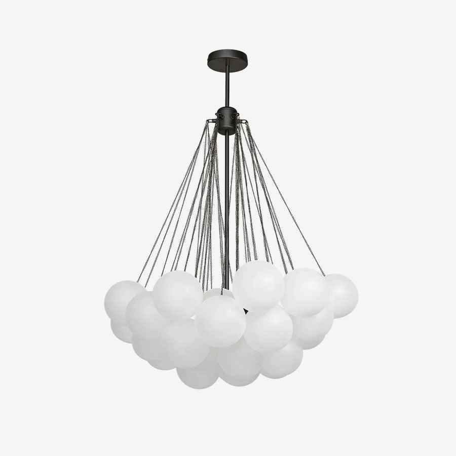 Силуэт светильника представляет собой подвесы со стеклянными стеклянными шарами, которые изготавливаются вручную, тем самым создавая неровную текстуру, напоминающую технику матирования стекла 19-го века. Три центральных источника света излучают мягкое свечение, которое преломляется через окружающее скопление сфер.