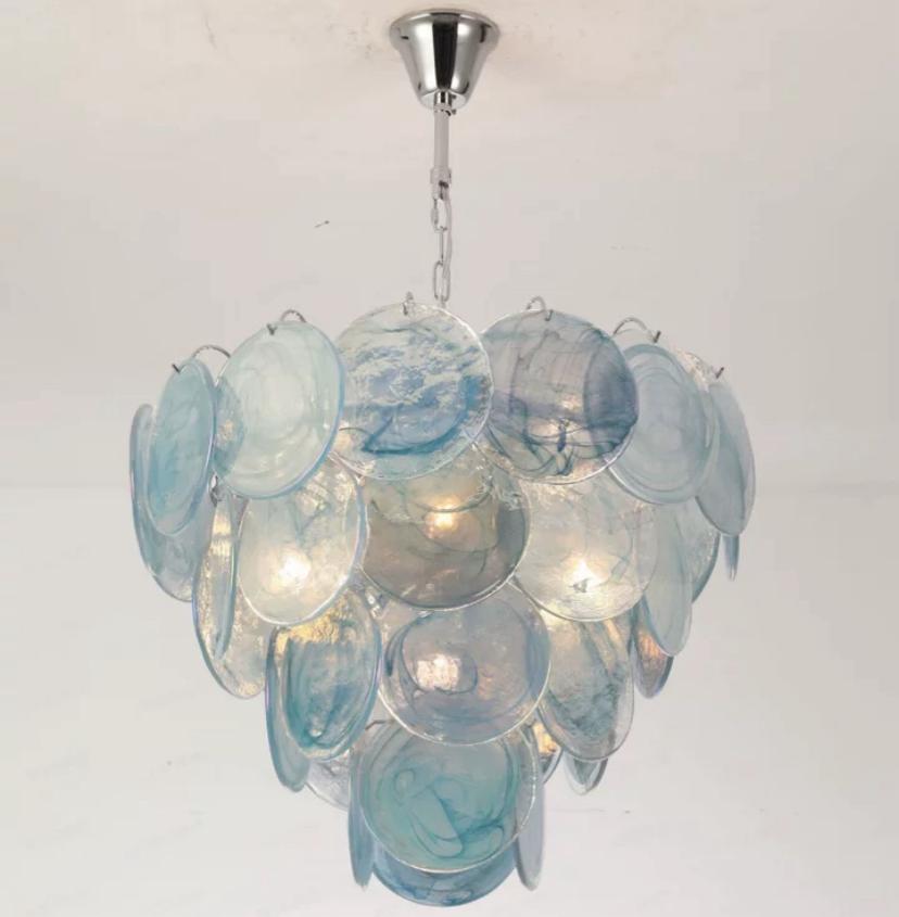 Люстра Casadei — Летний день тихо брезжит за окном, превращая знойные лучи солнца в благоухающие витражи, распускающиеся в зале. И в этом трепетном воздухе, причудливо устланном магией летней природы, светится люстра из круглых стеклянных круглых льдинок голубого цвета, словно нежная акварель, сотканная кистями самого неба.