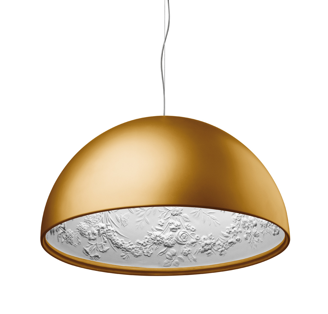Люстра Flos Skygarden является неотъемлемой частью внутренней обстановки любого помещения. Особенно, когда она изготовлена из самых современных материалов: металла и древесной смолы. Уникальное сочетание высоких технологий и природных компонентов делает люстру не просто источником света, а ультра стильным аксессуаром, который обязательно привлечет внимание ваших гостей. Металлический абажур в виде полусферы с нанесенным на него специальным покрытием крепится на кронштейне при помощи трех прочных тросов, которые позволяют регулировать высоту. Стильный узор в виде мелких цветов, украшающих люстру изнутри, делает ее внешний вид интересным и неповторимым. Особенно это касается того времени, когда свет включен, а лучи от лампочки отражаются от плавных изгибов узоров, искусно выполненных на природном материале.
