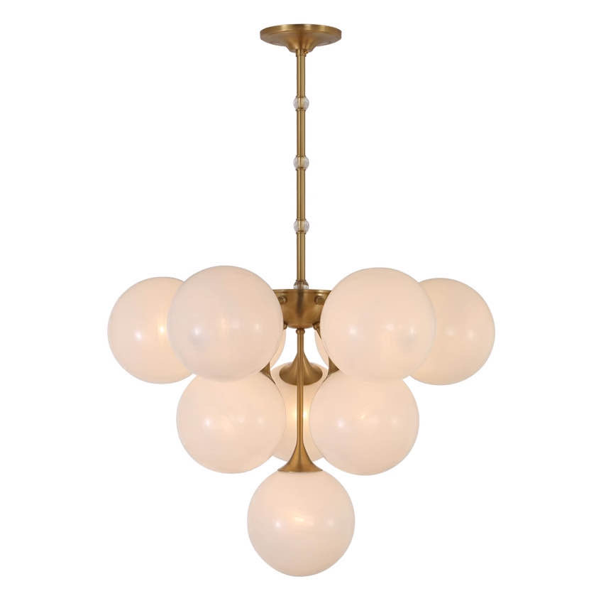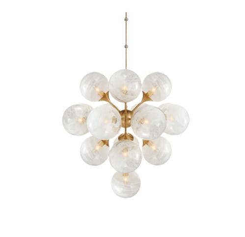 Эта роскошная люстра является истинным воплощением утончённости и элегантного дизайна. Она состоит из множества стеклянных шаров матового белого цвета, которые ненавязчиво преломляют свет, создавая мягкое, гармоничное освещение. Форма люстры напоминает изящную гроздь винограда, её шарики словно жемчужины плавно спускаются с потолка, придавая интерьеру лёгкость и воздушность. Расположенные на разной высоте, эти стеклянные сферы имитируют естественное скопление виноградной кисти, создавая динамичную, но одновременно сбалансированную композицию.