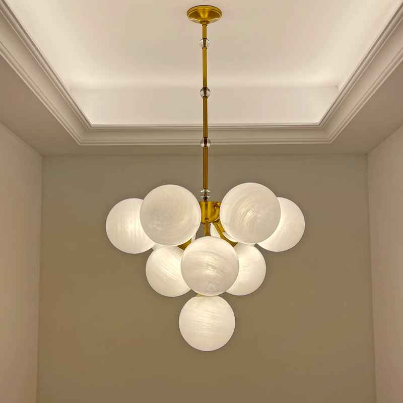 Основание люстры изготовлено из прочного металлического сплава с покрытием золотого цвета. Это не просто фурнитура, а важный элемент дизайна, который придаёт изделию неподражаемый лоск и великолепие. Золотистый металлик красиво сочетается с молочно-белыми шарами, создавая контраст, который подчёркивает эксклюзивность и выдержанность стиля. Деликатные детали фурнитуры выполнены с высокой степенью точности и мастерства, что делает люстру не только элементом освещения, но и статусным декоративным акцентом.