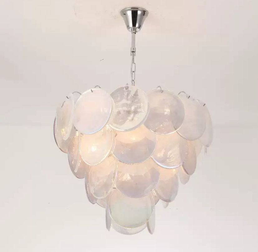 Люстра Illusion — замечательная люстра, выполненная из муранского стекла, является истинным произведением искусства. Ее стекло ручной работы представлено в виде больших белоснежных круглых плоских леденцов, украшенных перламутром. Каждый из них висит по кругу и расположен сверху вниз, создавая каскадный эффект.