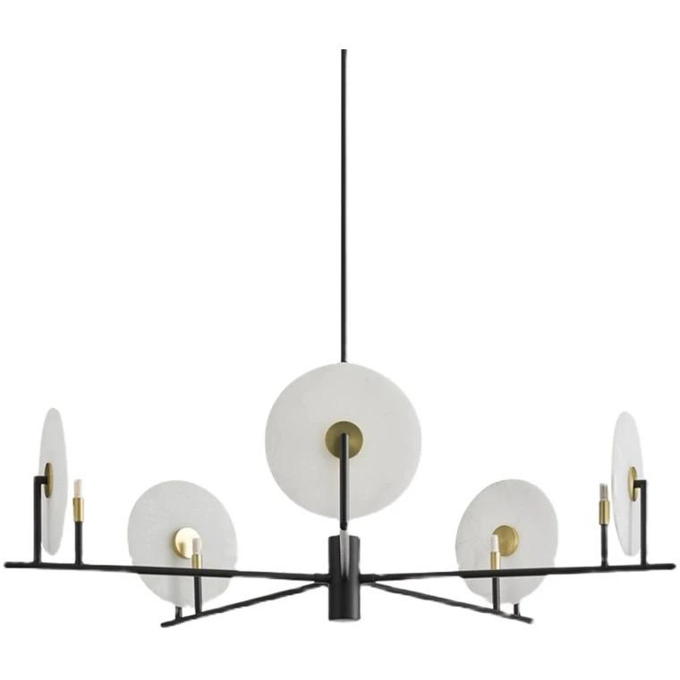 Декоративные элементы в виде плоских матовых дисков придают люстре изысканность и неповторимость. Они смешиваются с общим дизайном и придают ему утонченность. Каждый диск имеет уникальную форму и размер, что добавляет интерес и глубину внешнему виду люстры.