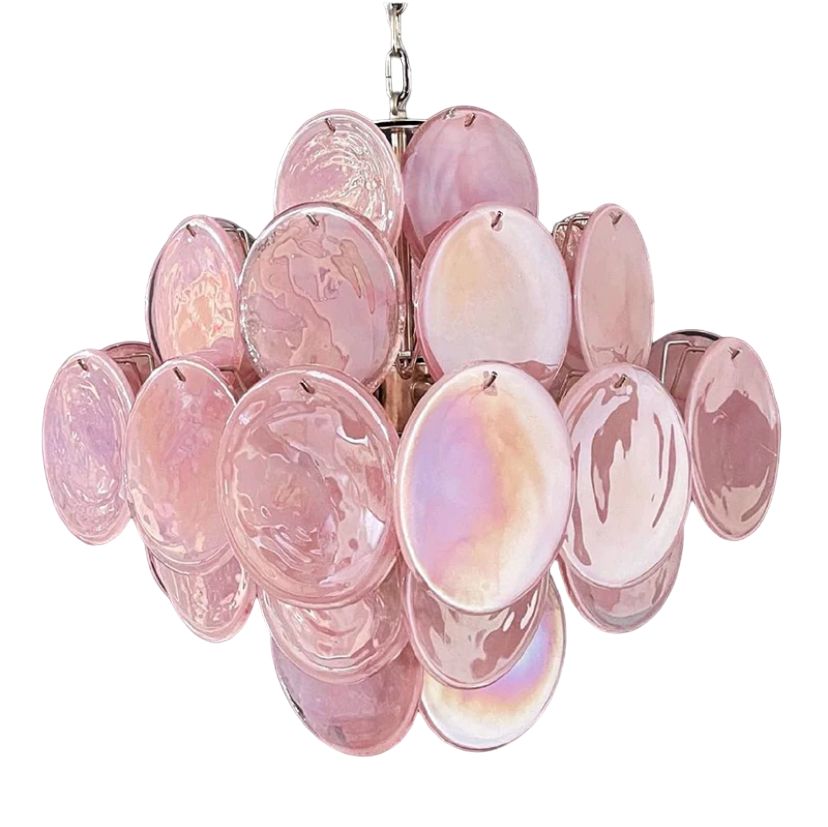 Люстра выполнена из муранского стекла нежного розового цвета, придающего ей изысканность и элегантность. Её центральная часть представляет собой большую форму шириной 60 см, из которой излучаются восхитительные оттенки розового цвета. Вокруг этой сферы расположены декоративные элементы в форме вкусных розовых леденцов, которые привлекают внимание своей круглой и плоской формой.