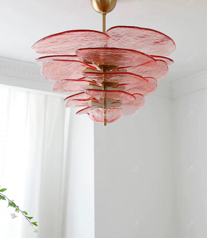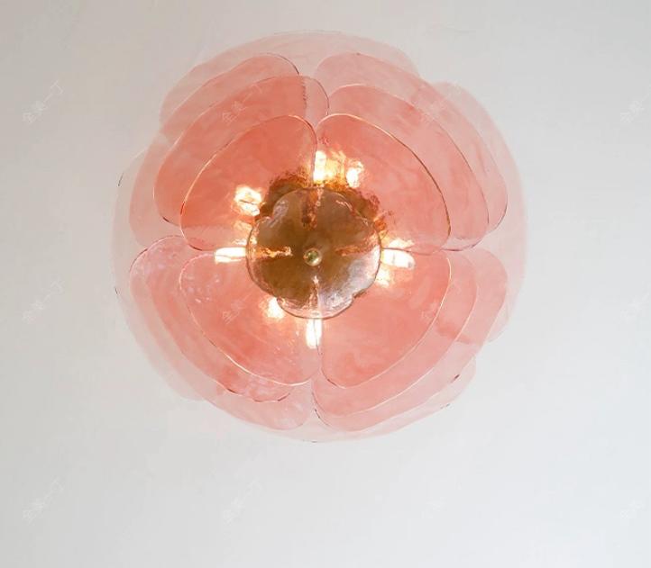 Предстает перед взором удивительный пейзаж, где розовое стекло и золото перекликаются, создавая световые рефлексы и игры. Люстра как живой организм составляет единое целое с пространством, окружающим ее. Она не только воплощает красоту в своей форме, но и наполняет помещение благородством и таинственностью.