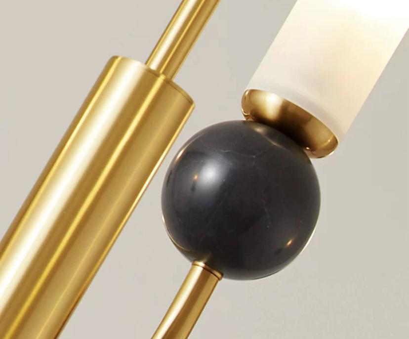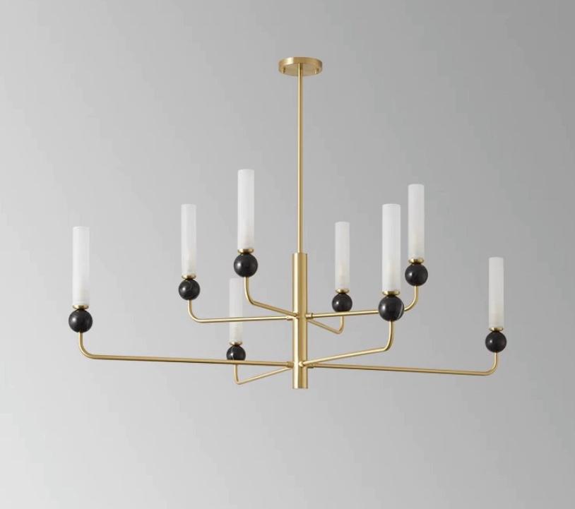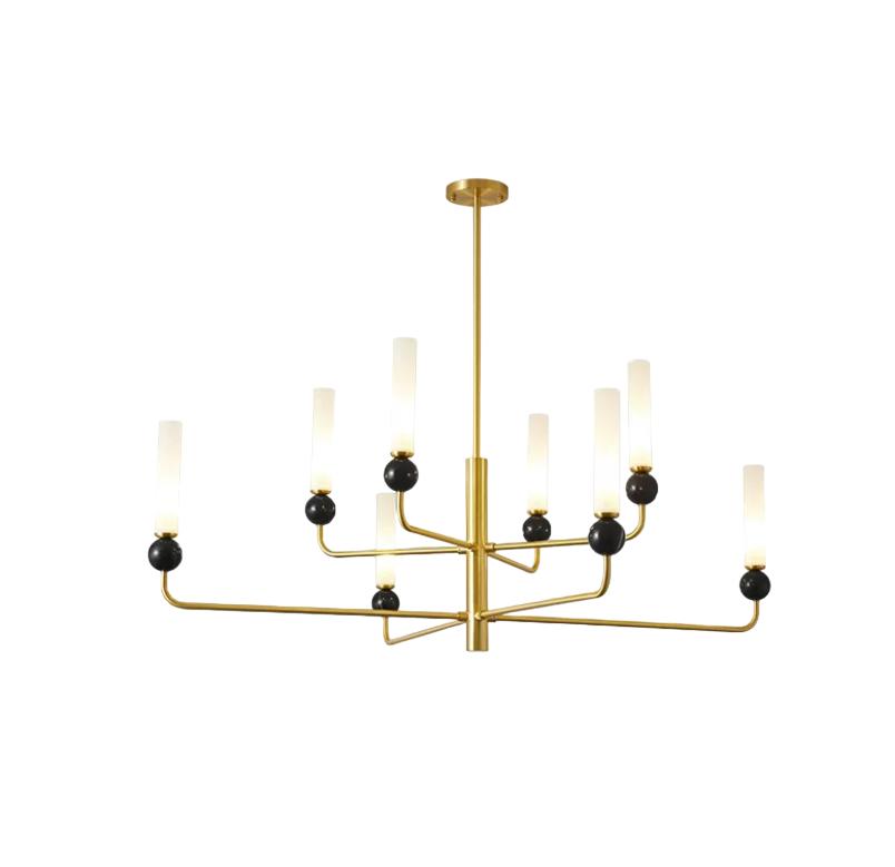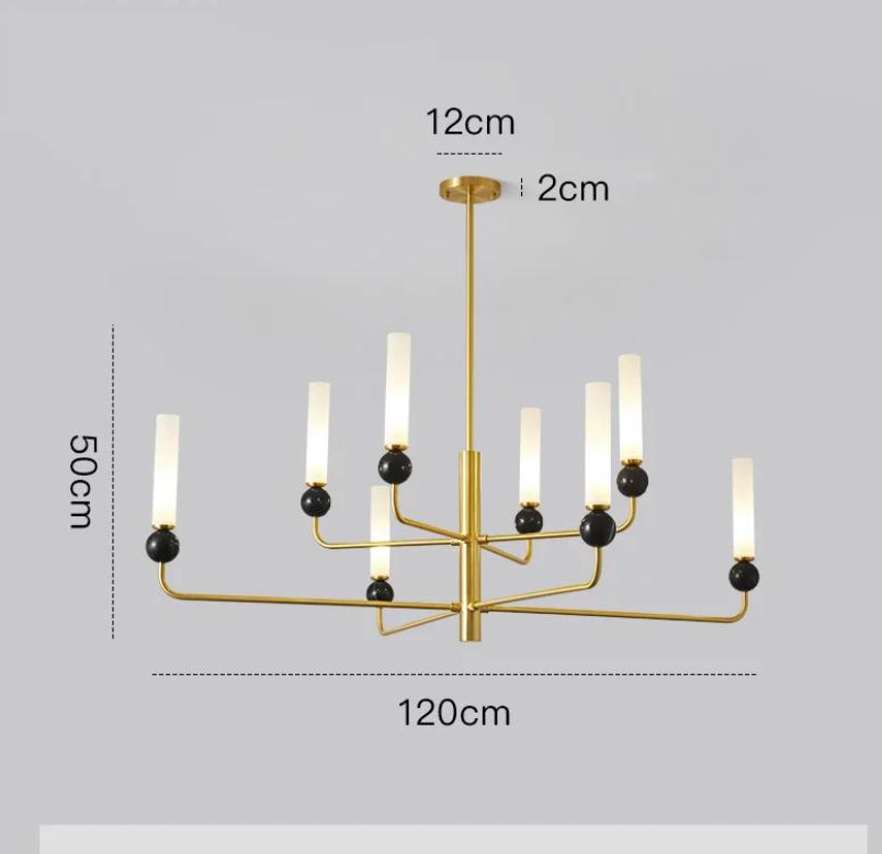 Люстра величественной формы имеет шесть лампочек, в основании лампочек черный камень круглого цвета, Лампы напоминают тонкие, высокие свечи. Они изготовлены из матового стекла, что придает особый эффект, распределяя свет равномерно и создавая воздушное пространство вокруг себя.