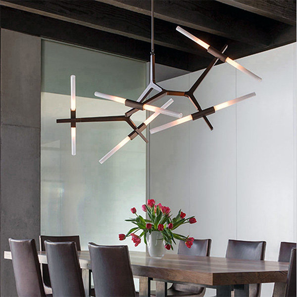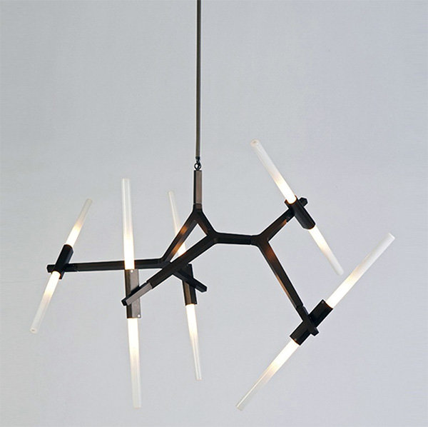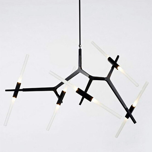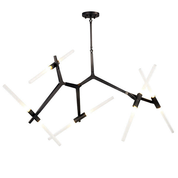 Стильная потолочно-подвесная люстра черного цвета, с десятью поворотными стеклянными плафонами, выполненными из матового стекла белого цвета.