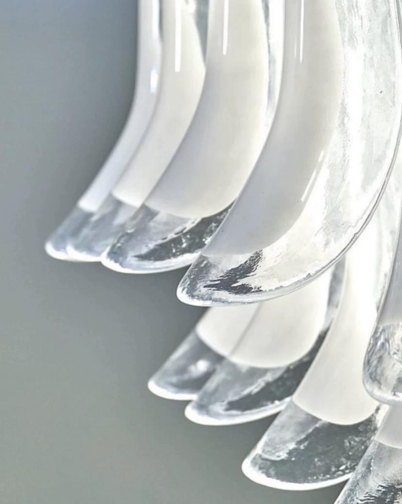Самым примечательным элементом этой люстры является стекло в форме лебединого пера, которое украшает ее по окружности. Этот эффектно выглядящий декор создает ощущение многослойности и добавляет изюминку в интерьер.
