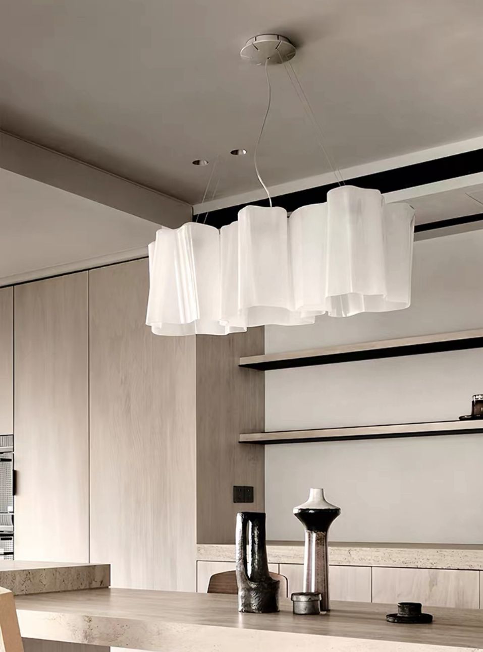Форма люстры – это настоящий гимн нежности и воздушности. Она напоминает искусно задрапированный кусок ткани или облако, застывшее в причудливых складках. Мастерски вылепленные изгибы и плавные переходы создают впечатление, будто люстра соткана из нитей света и тени. Каждый элемент, каждая складка, кажется, обладает своей собственной жизнью, добавляя в интерьер неповторимый шарм и элегантность.