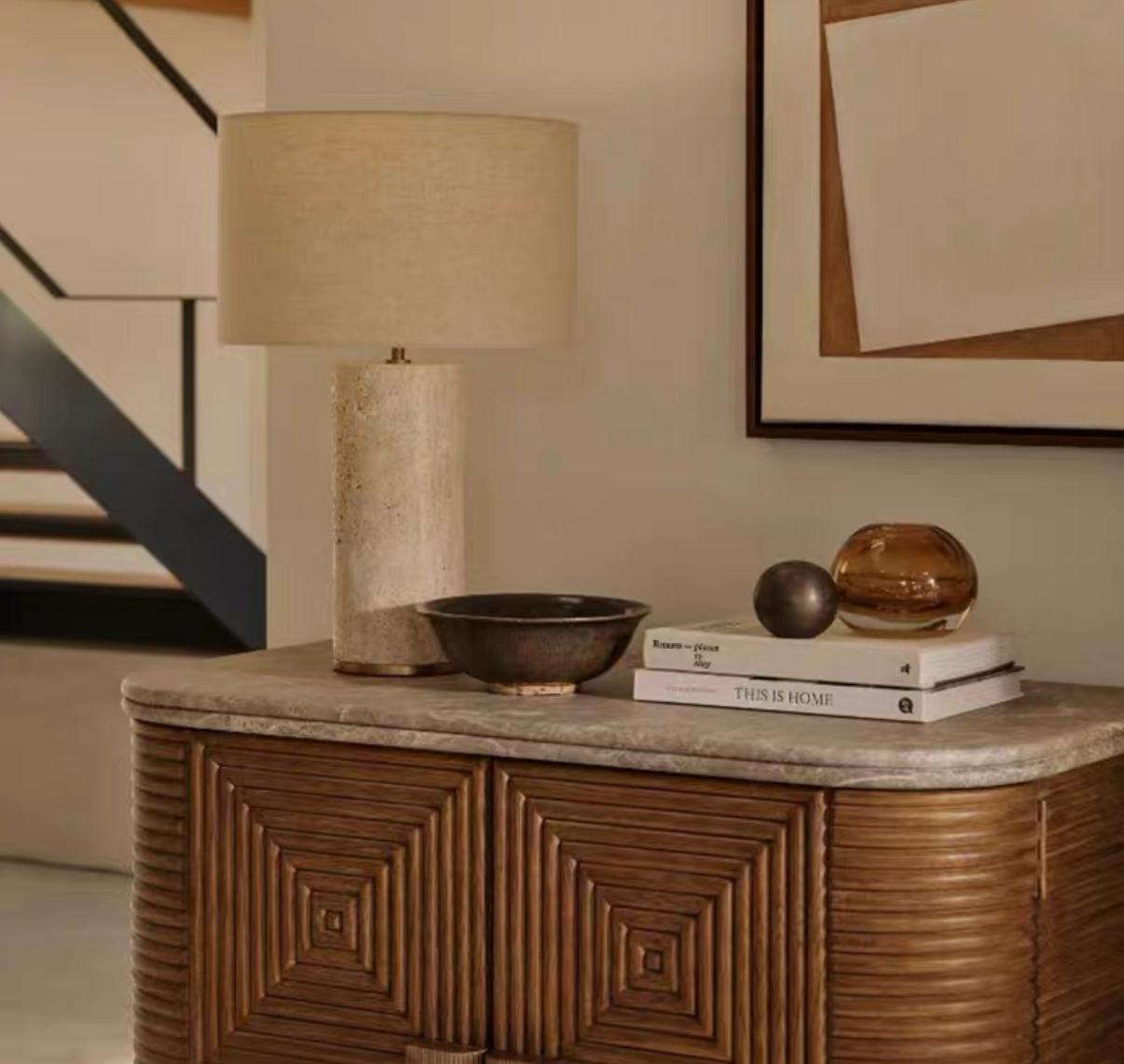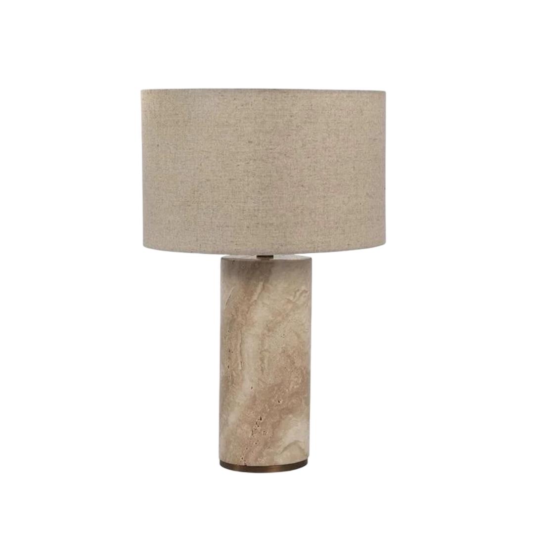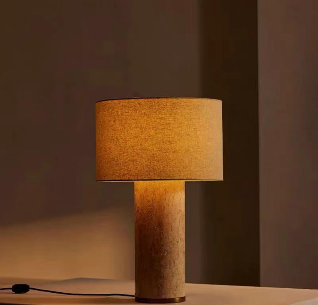 Основание лампы выполнено из травертина, камня с богатой историей и уникальным характером. Травертин имеет теплый бежевый оттенок, словно согретый солнцем песок. Его поверхность пористая и текстурная, с небольшими углублениями и бороздками, рассказывающими историю его формирования в недрах земли. Основание выполнено в виде простого, но элегантного цилиндра, подчеркивающего естественную красоту камня.