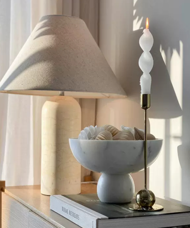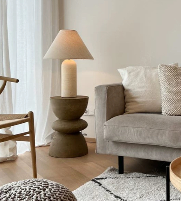 Поднимаемся выше и переходим к абажуру лампы. Он выполнен в конической форме, которая традиционно ассоциируется с классикой и функциональностью. Его материал — льняная ткань светлого оттенка, что не только гармонирует с нежно-бежевым основанием, но и усиливает ощущение лёгкости и воздушности.