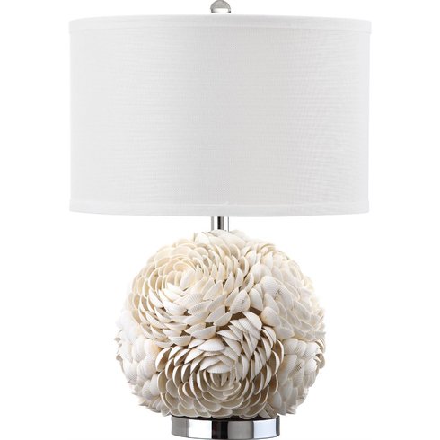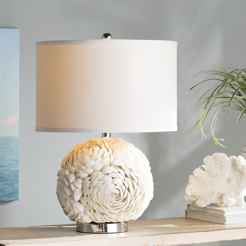 Стильная настольная лампа, выполненная в ручную подарит вашему интерьеру комфорт и теплоту. Корпус этого роскошного светильника выполнен в виде невероятных цветочных бутонов из редчайшей красоты ракушек. Настоящий шедевр на вашей тумбе!