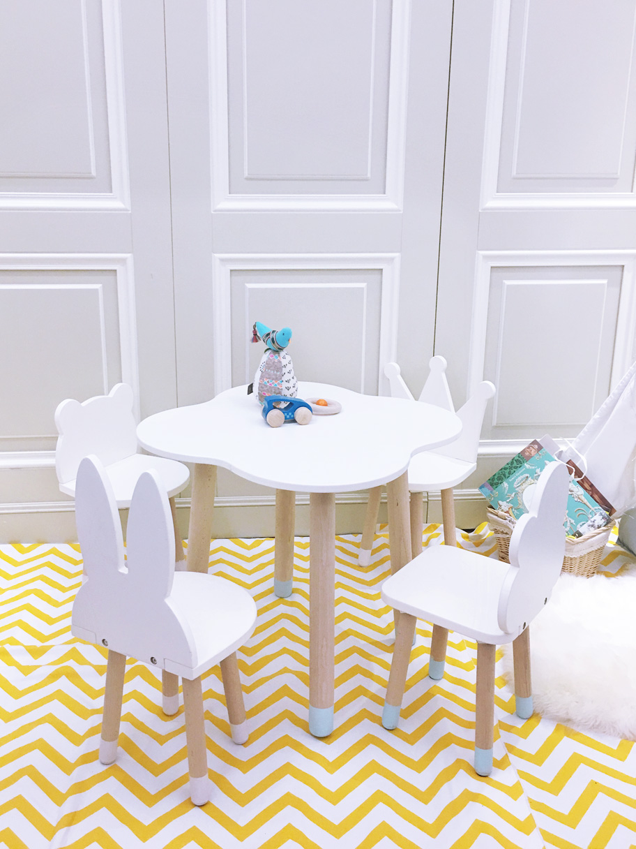 Размер: 56*56*51 см; вес: около 12 кг.; стул облачко: 25*25*56 см; стул зайка: 25*25*59 см; стул корона: 25*25*48 см; стул мишка: 25*25*48 см
