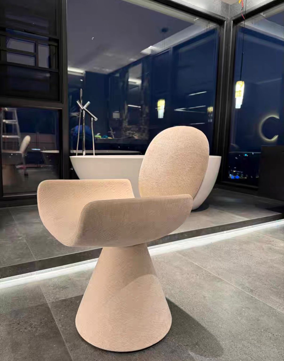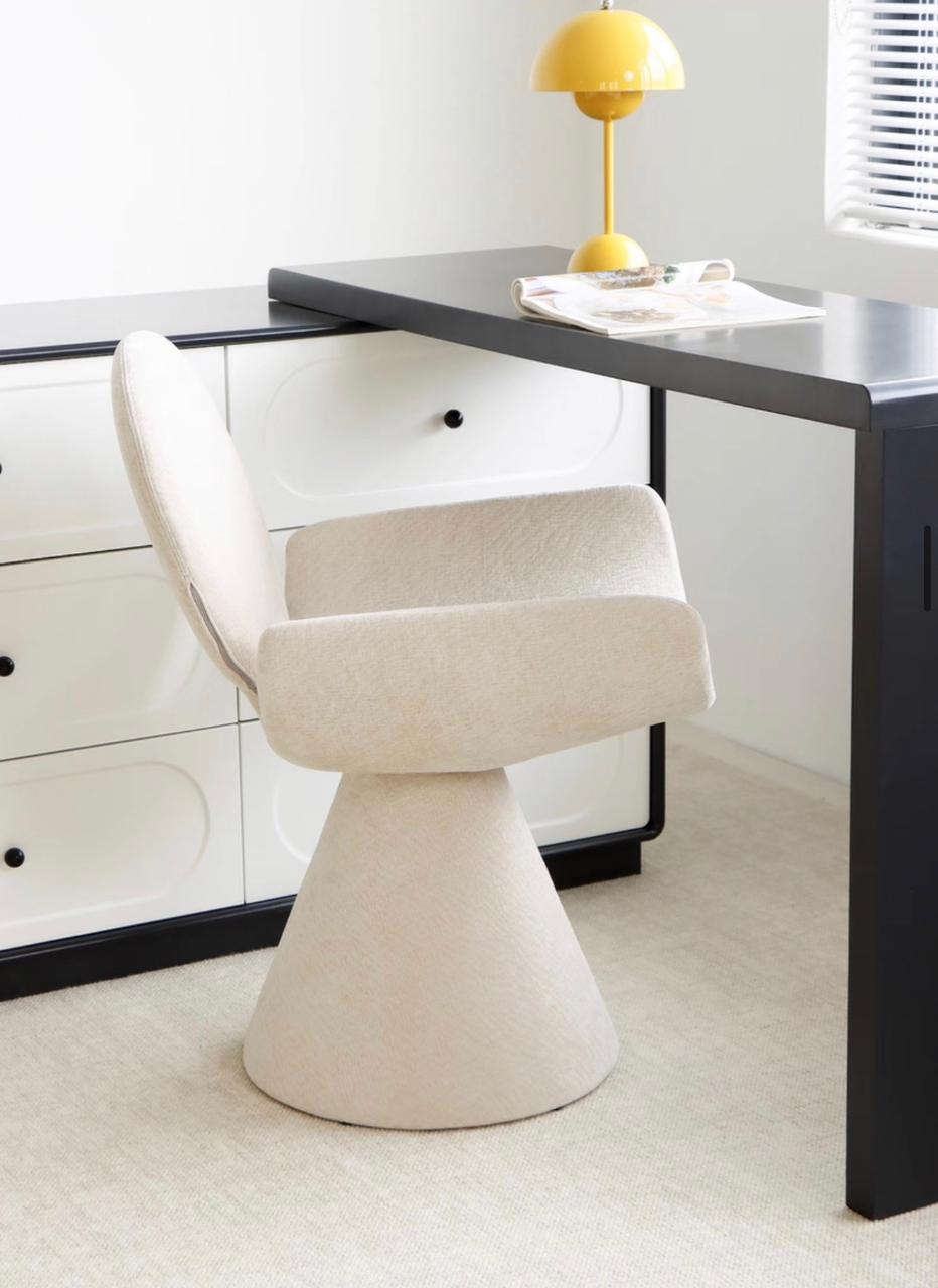 Материалы и тактильность Вся поверхность стула обтянута качественным текстилем светлого, теплого оттенка. Текстура ткани играет важную роль: она придает объем и глубину всей конструкции, создавая мягкий визуальный эффект «припудренности». Этот выбор материала делает стул не только эстетически привлекательным, но и невероятно приятным на ощупь. Ткань кажется плотной и долговечной, подчеркивая статус изделия и его предназначение для интенсивного, но комфортного использования. Светлая палитра делает стул воздушным, позволяя ему легко вписываться в интерьеры любой цветовой гаммы — от минималистичного монохрома до ярких современных стилей.