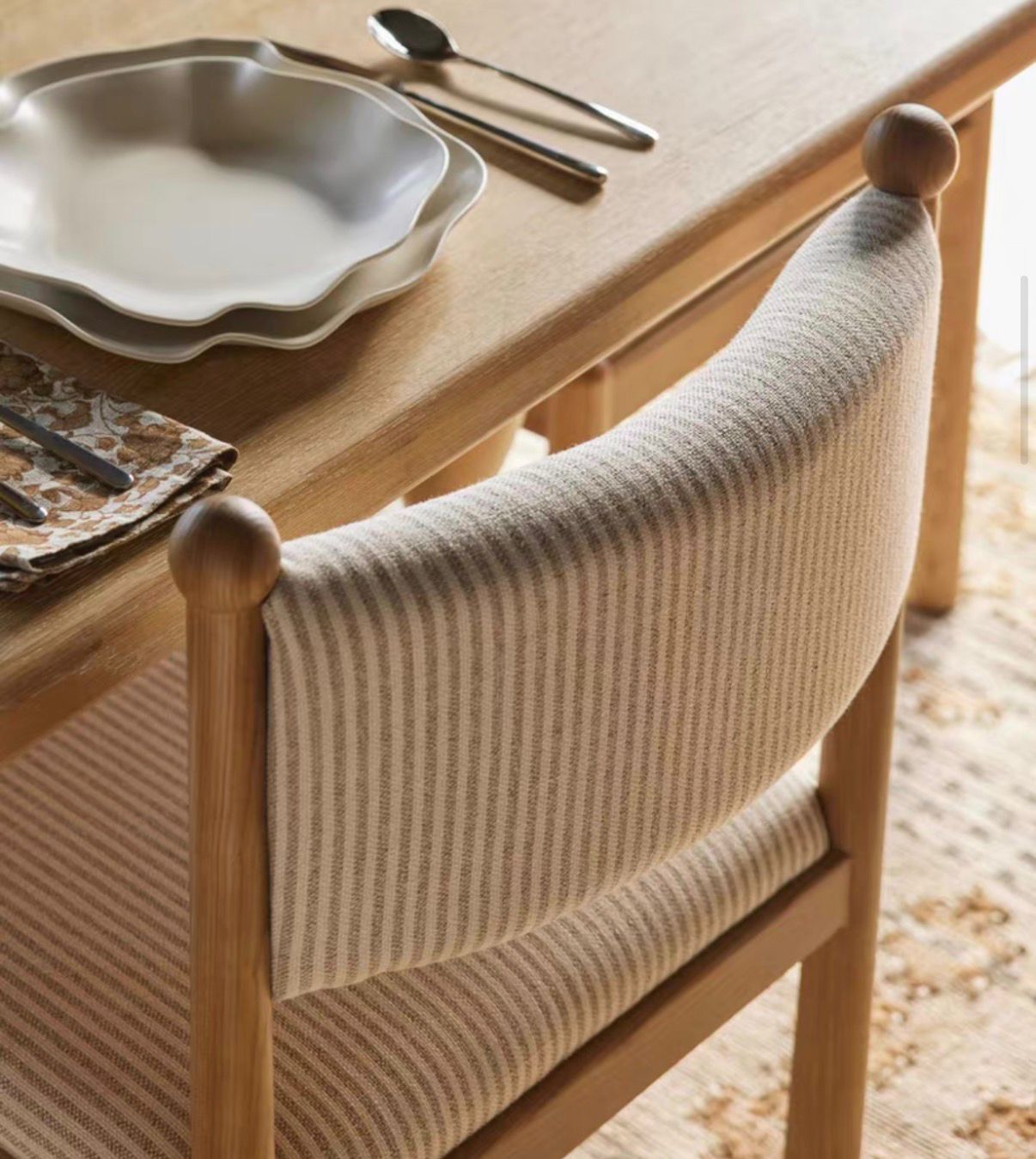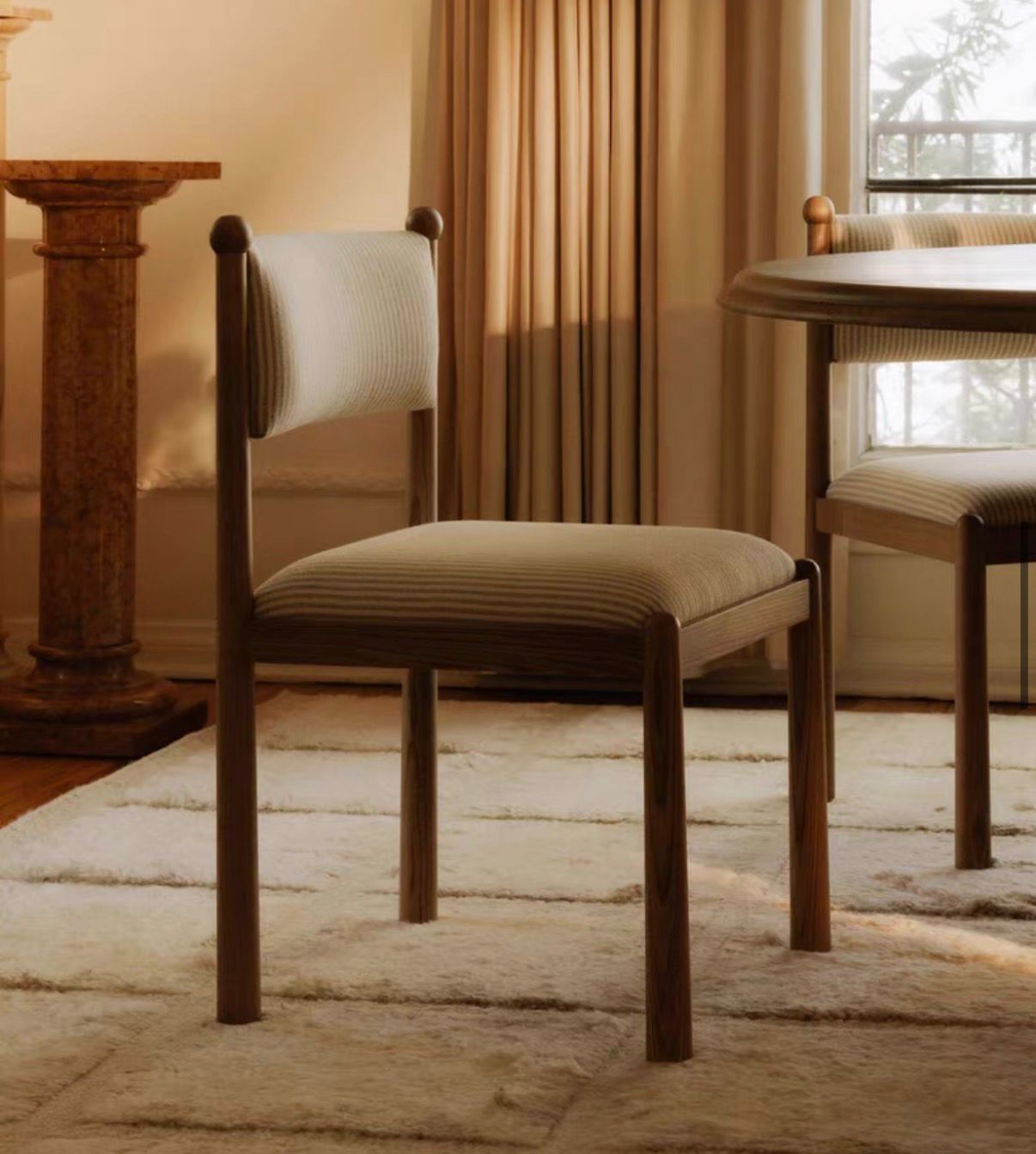 Спинка стула выполнена в виде мягкой подушки, которая закреплена на верхней части деревянного каркаса. Её форма слегка изогнута, следуя естественным линиям тела, что обеспечивает удобство при длительном сидении. Обивка спинки, как и сиденья, выполнена из ткани, имеющей мелкую, деликатную полоску в кремовых и бежевых тонах. Эта текстура добавляет глубины и тактильного интереса, а нейтральная цветовая гамма позволяет стулу легко вписаться в различные интерьеры.